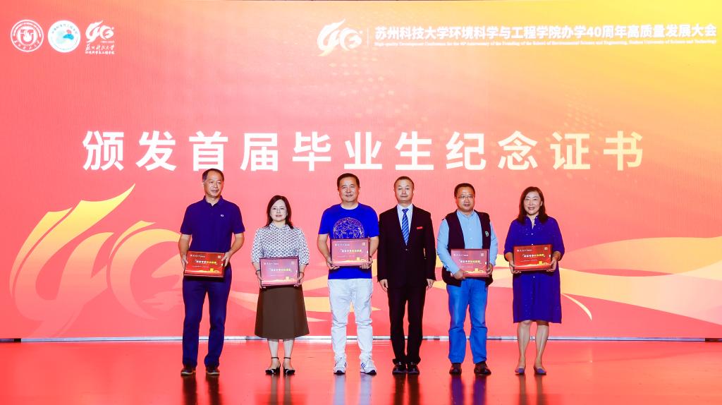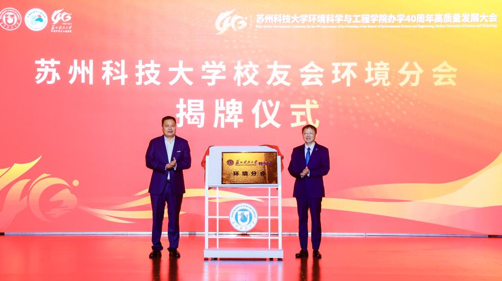 此外,大会还举行了两项具有特殊意义的仪式。李勇为学院首届毕业生代表颁发纪念证书,证书镌刻初创印记,既致敬学子“同向同行”,也承载学院与学子四十载深厚情谊。姜朋明与孙加山共同为“苏州科技大学校友会环境分会”揭牌,标志着学校与校友间的联系纽带进一步强化,为未来深化校友合作、助力学科发展与人才培养搭建了新平台。