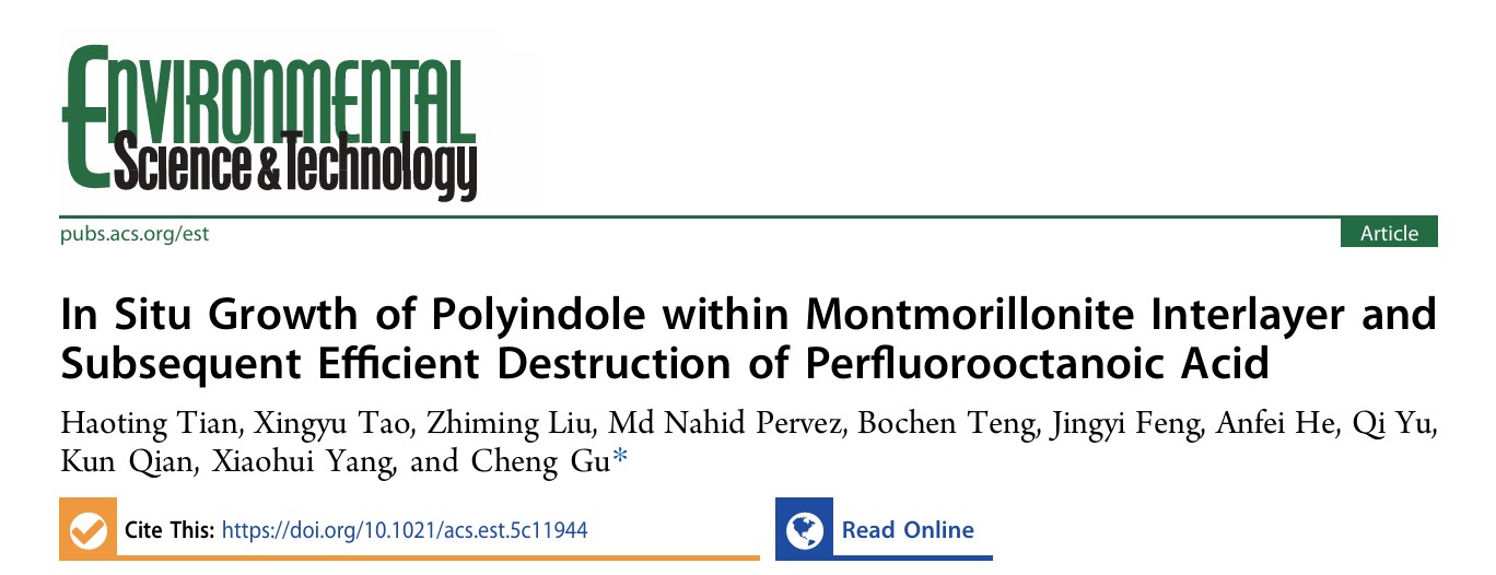 近日,我校环境科学与工程学院田浩廷副教授的最新研究成果刊登在环境类顶级学术期刊《Environmental Science & Technology》上,研究成果题目为“In Situ Growth of Polyindole within Montmorillonite Interlayer and Subsequent Efficient Destruction of Perfluorooctanoic Acid”。 我校为该文章的第一单位,田浩廷副教授为第一作者。