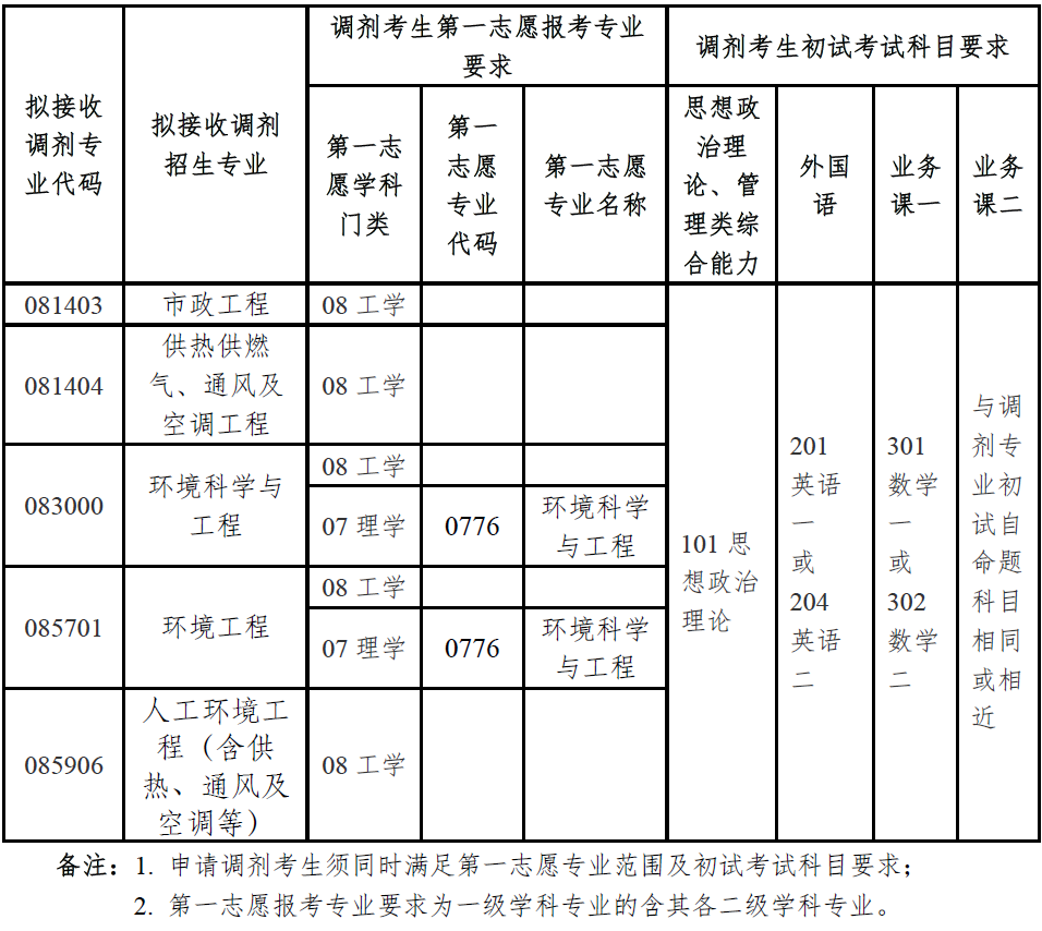 申请调剂考生基本条件须符合《苏州科技大学2026年硕士研究生招生调剂工作办法》相关规定。我院接收调剂考生第一志愿专业范围及其相关要求见下表: