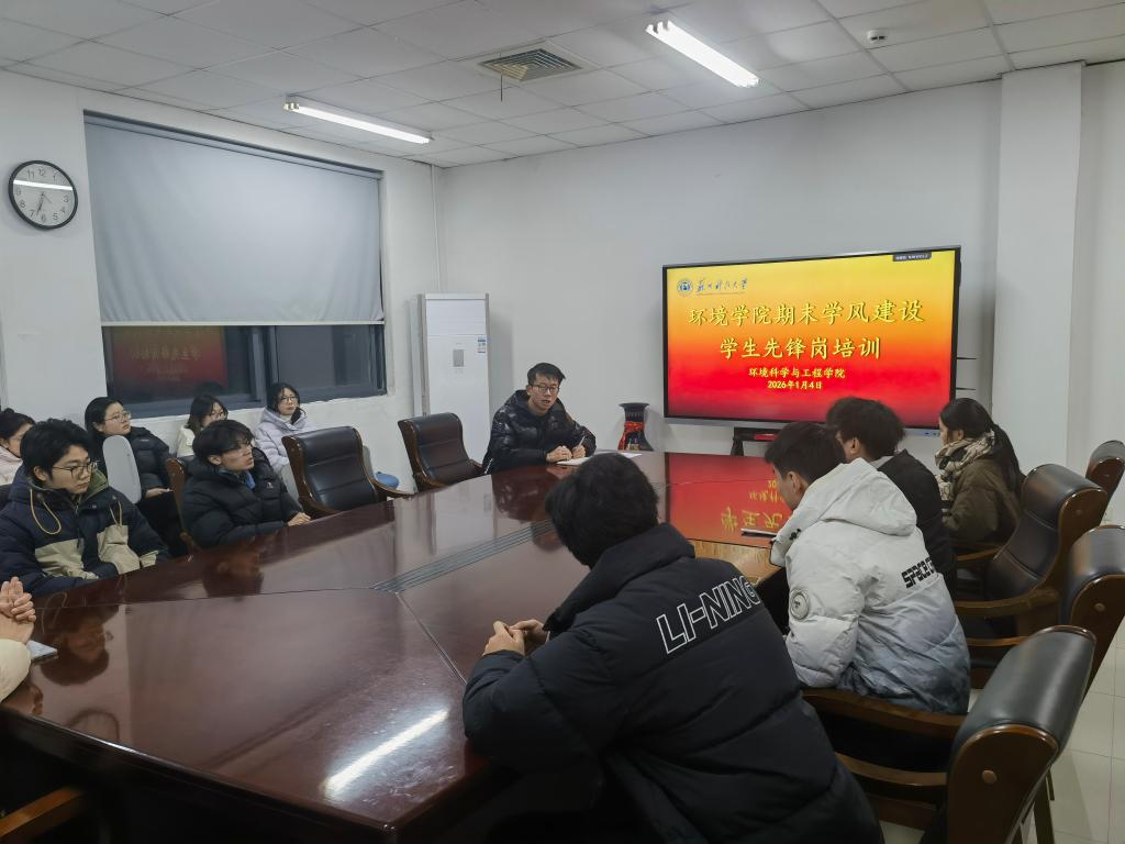 为筑牢期末学风建设防线,充分发挥学生党员和入党积极分子的先锋模范作用。1月4日晚,环境学院组织开展期末学风建设学生先锋岗培训。培训旨在引导学生党员和入党积极分子配合学院学工做好期末考试周期间的学风督查相关工作,为营造公平公正的考试环境奠定坚实基础。
