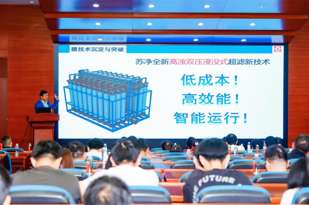 林振锋结合当前全球水资源短缺、水污染治理难度加大的现实背景,通过对比传统水处理技术的局限性,如处理效率低、能耗高、出水水质不稳定等,强调了研发与推广高效水处理新技术的重要性与迫切性。他指出,膜分离技术作为水处理领域的核心技术之一,近年来不断迭代升级,而新型外置MBR膜-苏净高浊双压浸没式超滤新技术,正是融合了外置MBR膜与高浊双压浸没式超滤技术优势的创新成果,为复杂水质处理难题提供了全新解决方案。在应用案例分享部分,林振锋结合国内多个实际工程项目,生动讲述了新型外置MBR膜-苏净高浊双压浸没式超滤新技术的落地应用效果。讲座互动环节,硕士研究生们围绕新技术的研发难点、工艺优化方向、未来产业化前景等问题积极提问。林振锋结合实验研究与工程实践,从膜材料改性、运行参数优化、清洗工艺创新等方面给出了详细解答。